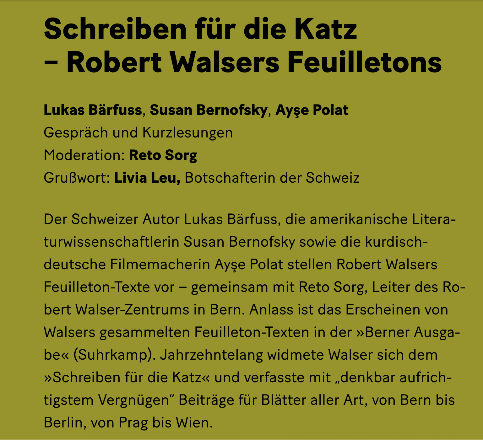 Der Schweizer Autor Lukas Bärfuss, die amerikanische Literaturwissenschaftlerin Susan Bernofsky sowie die kurdisch-deutsche Filmemacherin Ayşe Polat stellen Robert Walsers Feuilleton-Texte vor – gemeinsam mit Reto Sorg, Leiter des Robert Walser-Zentrums in Bern. Anlass ist das Erscheinen von Walsers gesammelten Feuilleton-Texten in der »Berner Ausgabe« (Suhrkamp). Jahrzehntelang widmete Walser sich dem »Schreiben für die Katz« und verfasste mit „denkbar aufrichtigstem Vergnügen“ Beiträge für Blätter aller Art, von Bern bis Berlin, von Prag bis Wien.